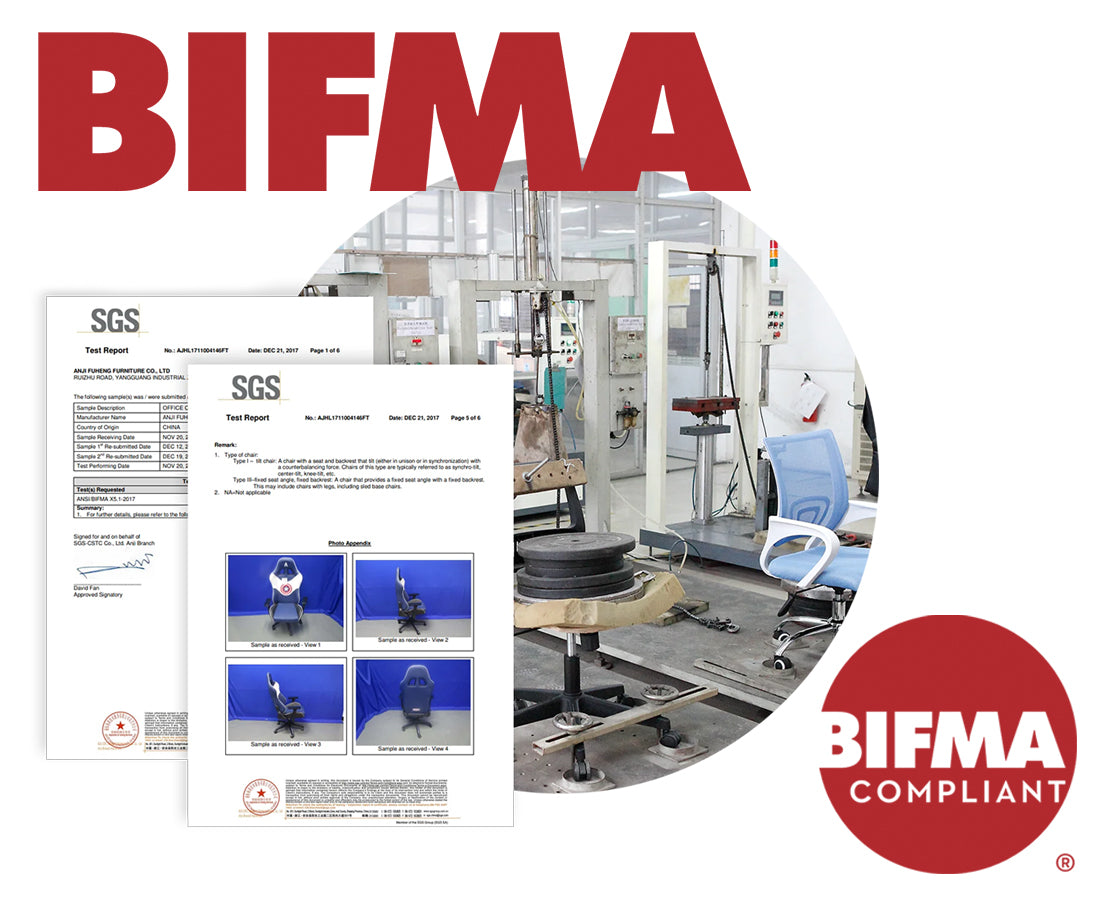 BIFMA規格(Business and Institutional Furniture Manufacturers Associations)とは、ANSI(米国国家規格協会)が認定したアメリカにおけるオフィス家具の規格であり、家具品質の世界基準となっています。BIFMAの認定には製品に応じた試験が必要となり、安全性・耐久性・機能性・環境配慮など様々な基準が設けられています。BIFMAはより細かい試験内容が制定されていることから、日本の家具基準であるJIS規格よりも厳しいとされています。