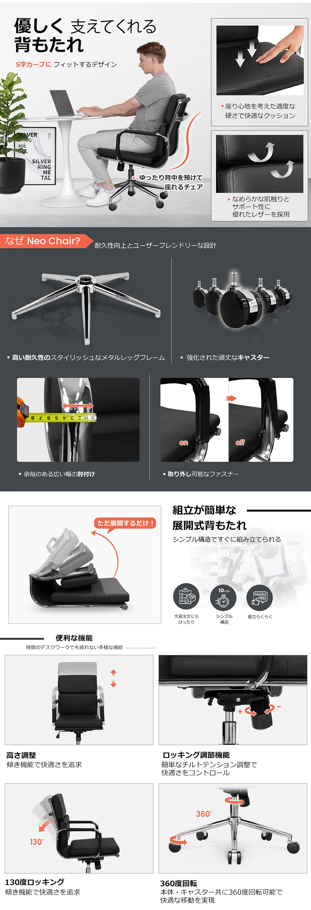 ●【快適な姿勢が続く人間工学設計】NEO CHAIR独自開発の、人間工学に基づいて設計されたデザインチェア。理想的なカーブの背もたれと反発力のあるレザーが身体を支え、長時間のオフィスワークや自宅での作業時にも健康的な姿勢をキープできます。