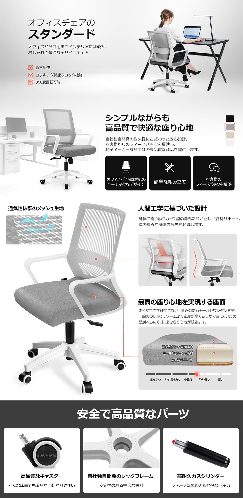 801 オフィスチェア メッシュ チェア 通気性 腰痛予防 グレー
