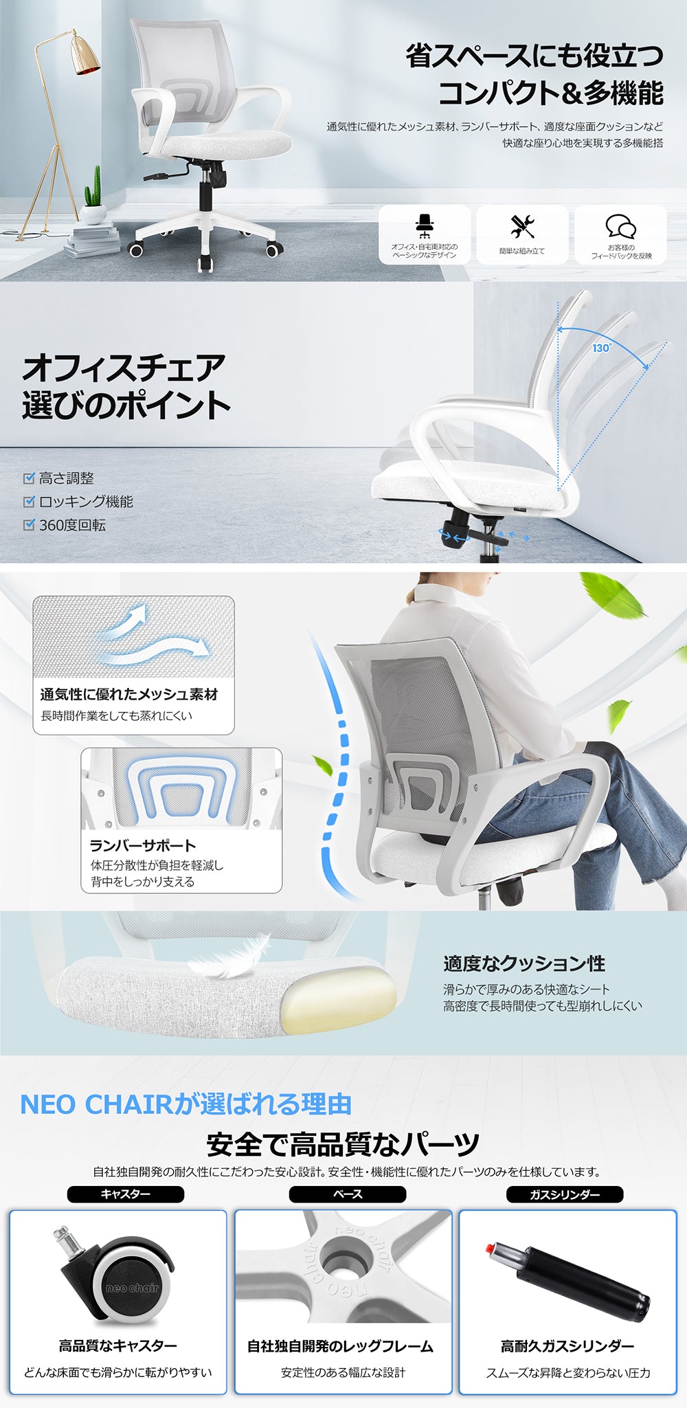 通気性抜群の3Dエアメッシュ 肌に優しく、汚れやシミに強い3Dエアメッシュ素材を採用。長時間座っても蒸れにくく、一年中さらっとした肌触りが続きます。