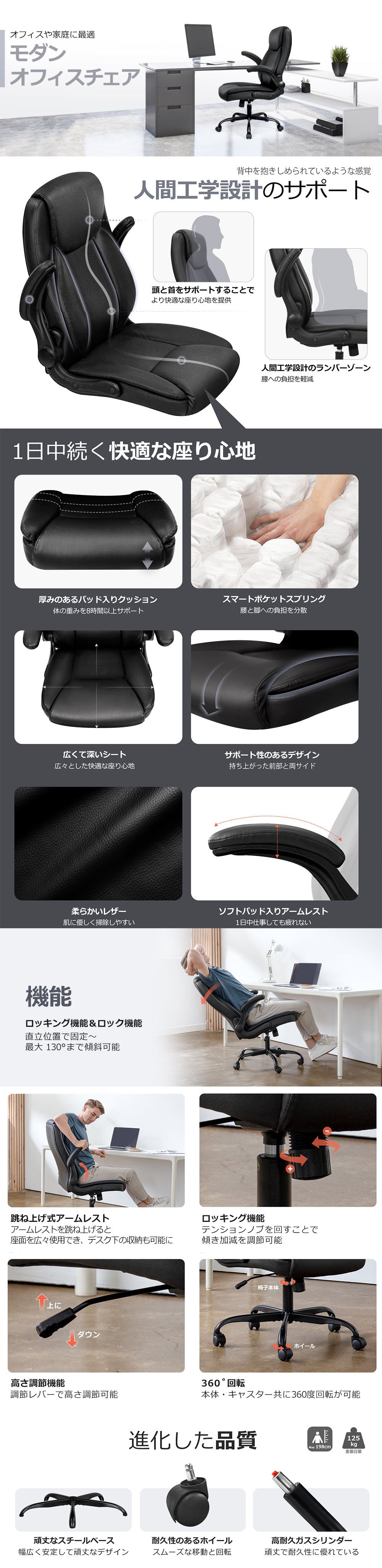 利便性を追求した跳ね上げ式アーム クッション付きの肘置きが腕の疲れを軽減。跳ね上げればデスク下にスッキリ収まるだけでなく、椅子の上でリラックスしたい時にも最適です。