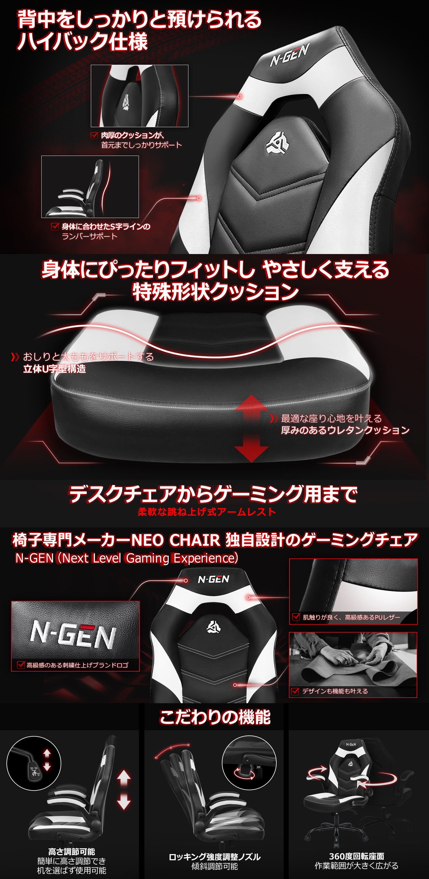 - 【オリジナルゲーミングチェアブランド 『N-GEN』】N-GEN(ネクストジェネレーション)はNEO CHAIRオリジナルのプレミアムゲーミングチェアブランドです。優れた品質、こだわりのディテール、ユーザーに最適化されたデザインを追求し、ハイレベルなゲーミングチェアをリーズナブルな価格で提案します。